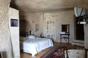 They’re dark and evocative, annoying at times but always seductive. The quality of Göreme’s cave rooms varies from hotel to hotel. Some are swank, some are dank. The Traveller’s Hotel is a new mid-range boutique variety, with luxurious bedding and pro blow dryers in the bathrooms. Most rooms have small fireplaces. All have heaters. At least one room has a Jacuzzi bathtub but it’s too small for two people. Most important for us is the in-room WiFi, which is not standard even at the best of cave hotels.