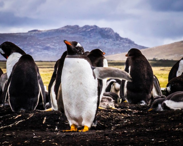 On the Falkland Islands, I went to two different penguin breeding grounds. The first one was on a pretty little beach called Bluff Cove, which is a temporary home to several different types of penguin, including the Gentoo. He’s the guy in the foreground with the orange beak.